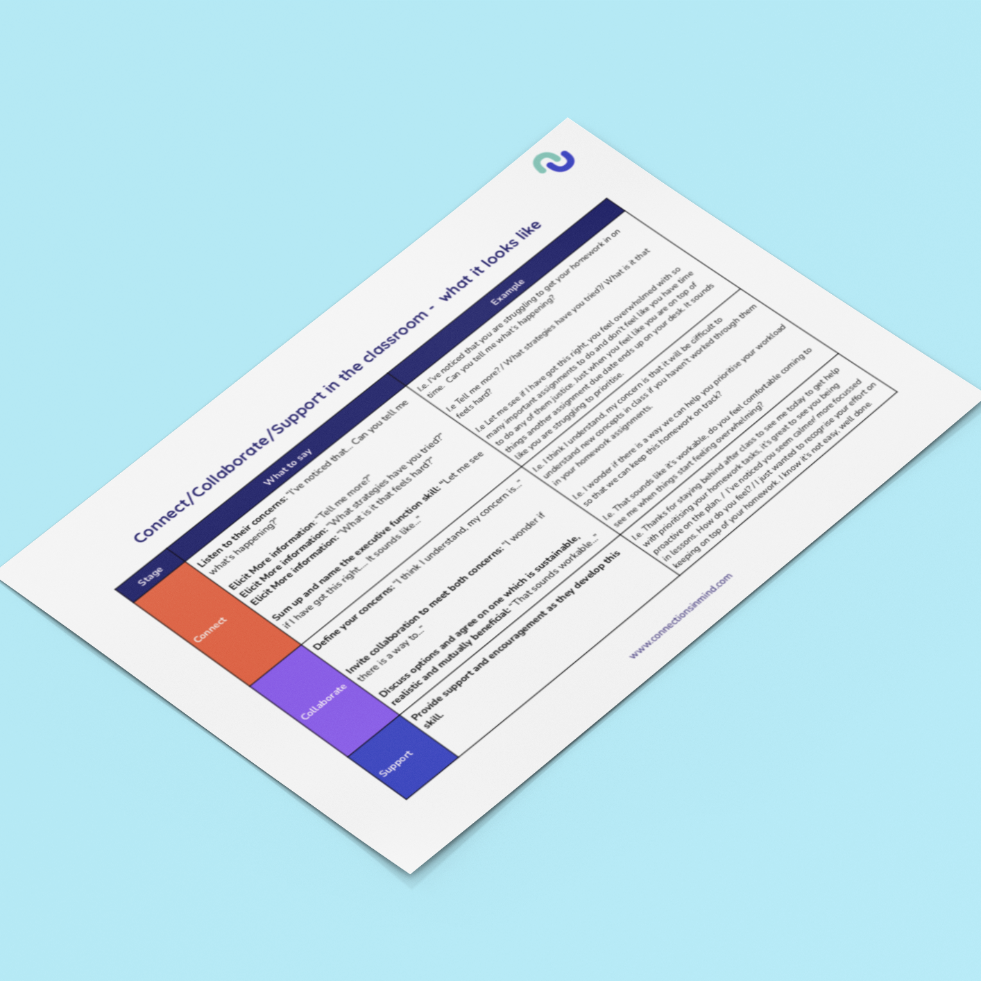 We developed this script table to help teachers foster meaningful conversations with their students around executive function challenges. The Connect Collaborate Support framework encourages open communication, collaboration, and practical solutions to help students overcome academic challenges and build essential life skills.